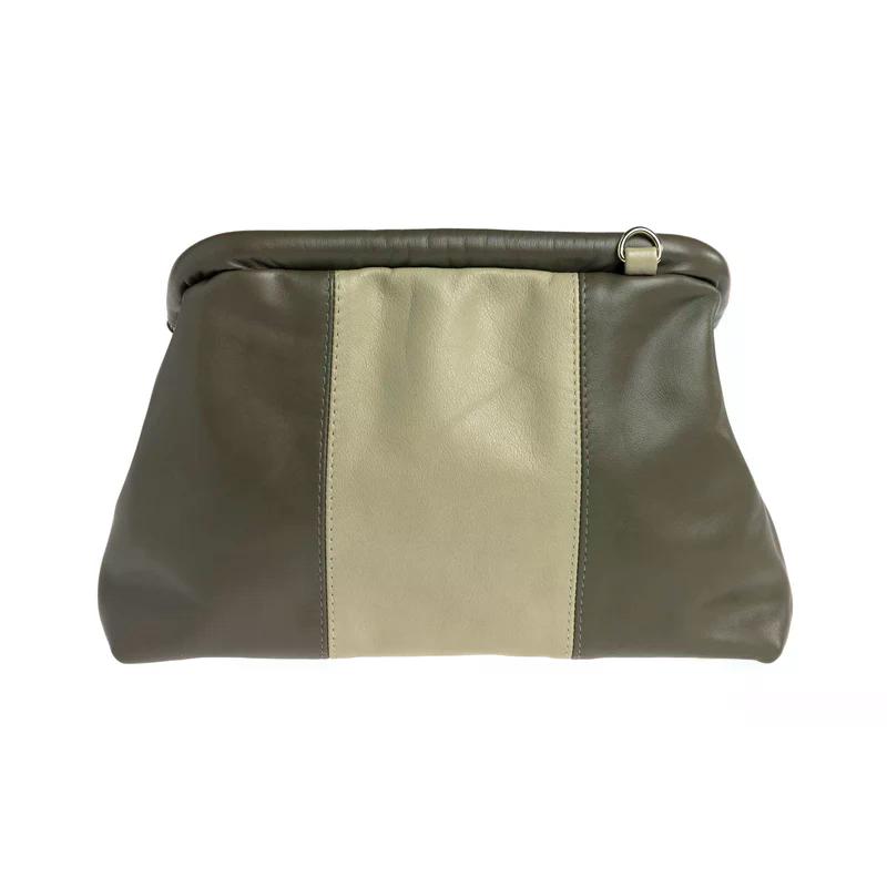 Elegante Umhängetasche aus hochwertigem Rindsleder in sanftem Grün, aus der Serie Bags for Humanity. Mit goldfarbener Ketten-Schulterriemen, weichem Fleecefutter und praktischem Klapp-Verschluss.