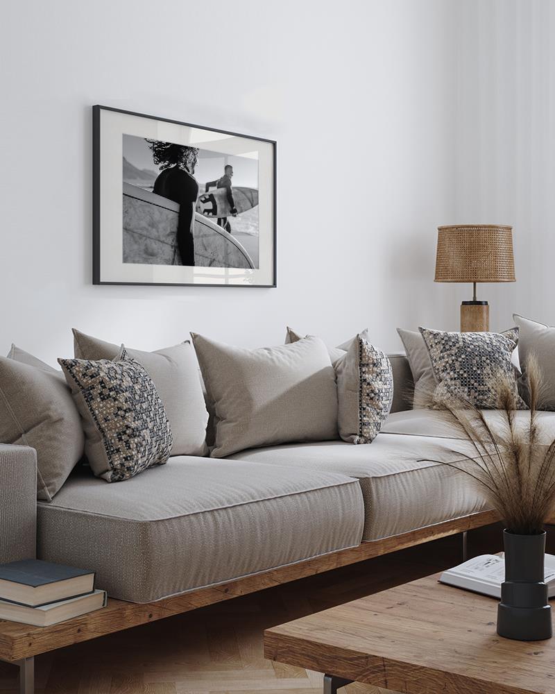 Das Schwarz-Weiß-Bild – Surfing Friends – fängt die unbeschwerte Freude zweier junger Menschen ein, die eifrig zum Meer sprinten. Es vermittelt die Essenz von Jugend und Abenteuer in einem einzigen Bild. Der hochwertige Druck ist in einem eleganten Rahmen aus schwarzem Buchenholz mit Passepartout eingefasst, inklusive Aufhängesystem.