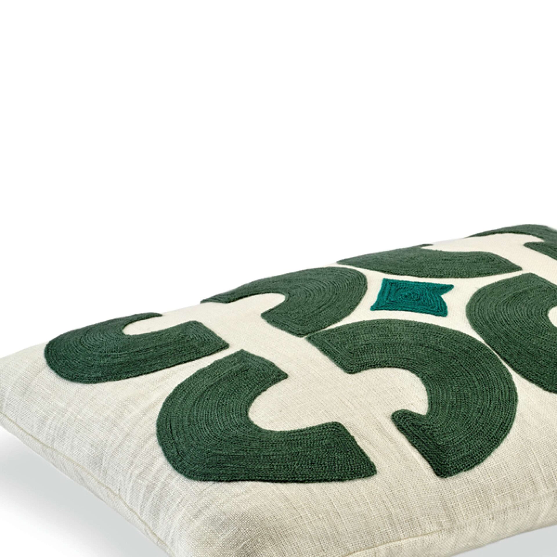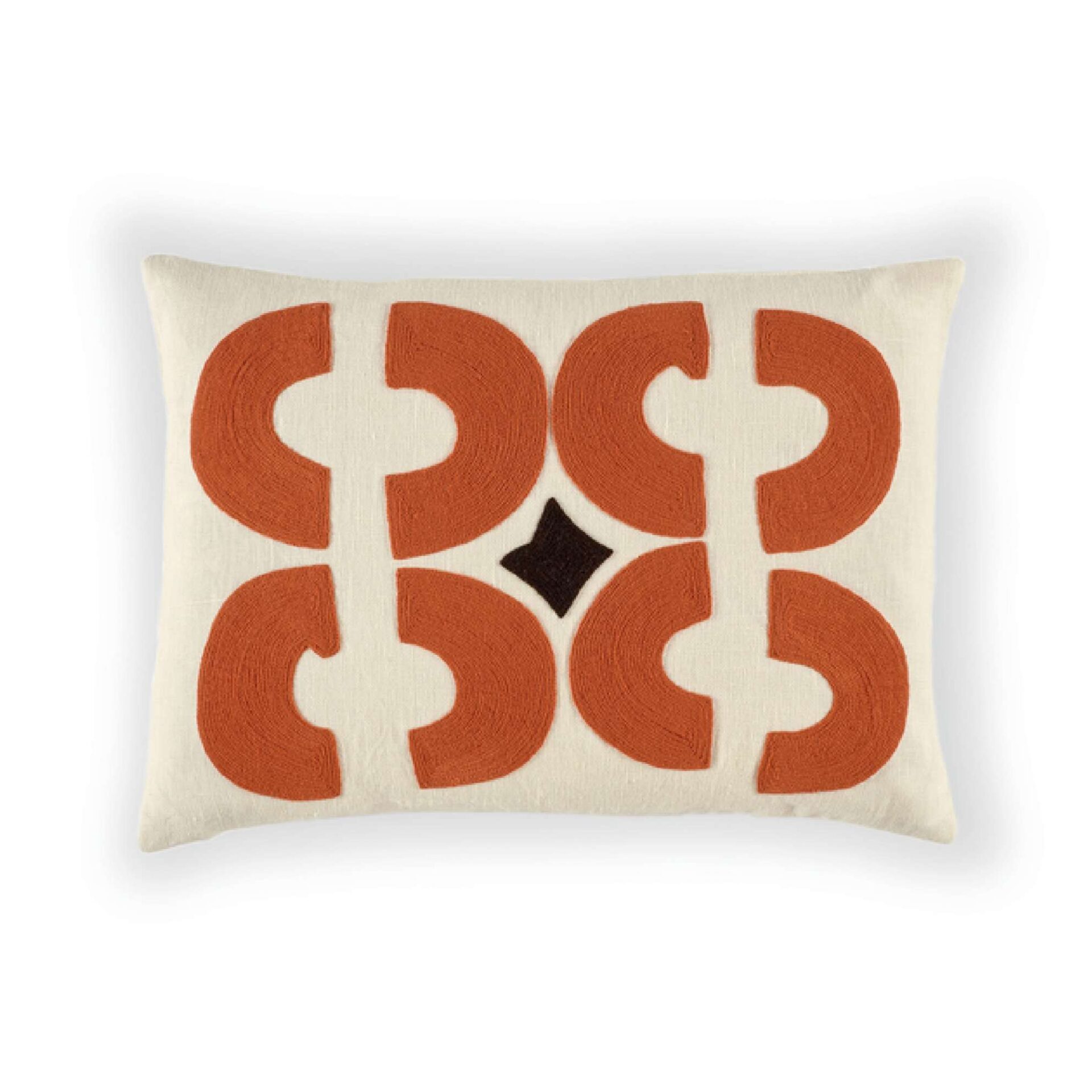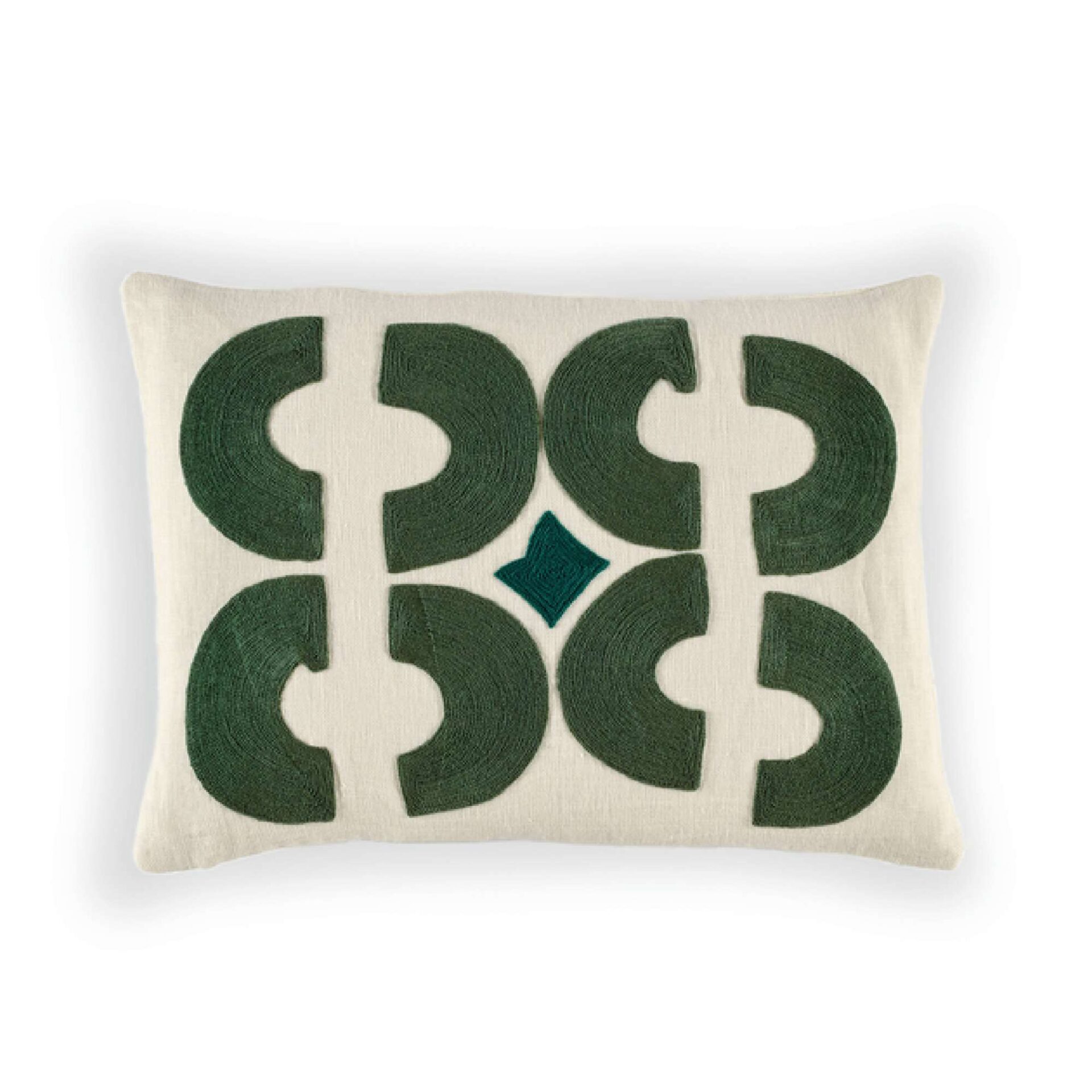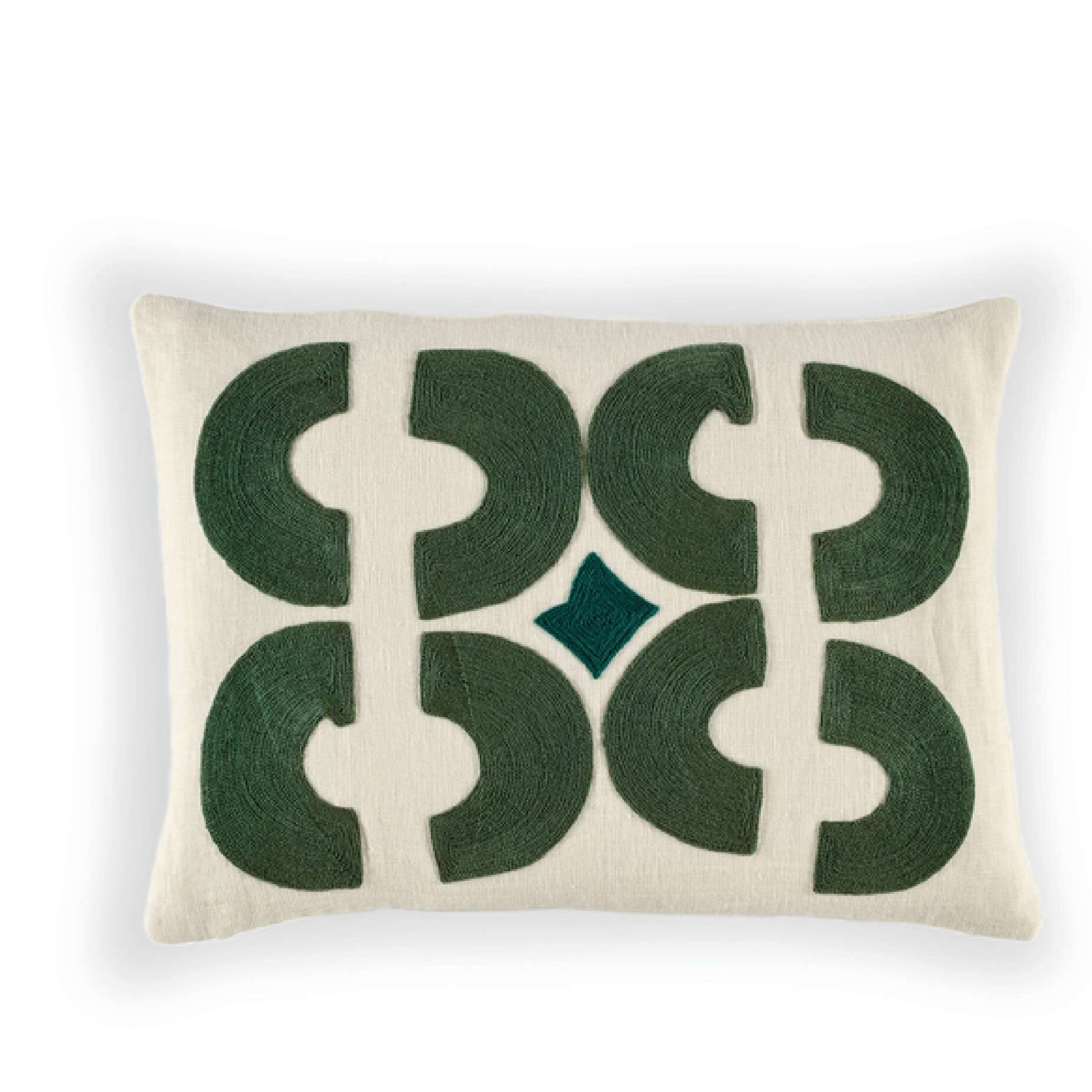 Kissenbezug Bahia in diversen Farben. Eleganter Leinen-Kissenbezug mit vier gestickten Kreis-Motiven im Kettenstich. Rückseite aus weichem, vorgewaschenem Leinen. Handgefertigt.