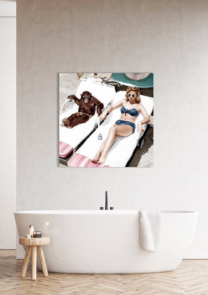 Startseite » Shop » Alubild Badenixe mit Schimpanse