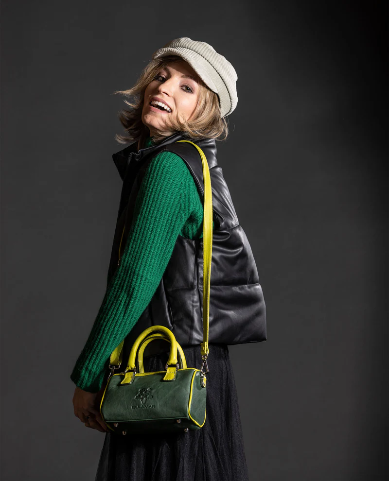 Die Mini Bag Bilbao ist ein eleganter Alltagsbegleiter im kompakten Format. Gefertigt aus pflanzlich gegerbtem Rindsleder in edlem Grün, kombiniert sie Glattleder- und Nubukleder-Elemente zu einem stilvollen Gesamtbild. Das gefütterte Innenleben bietet ein Hauptfach sowie ein zusätzliches Steckfach mit Reißverschluss – ideal zur sicheren Aufbewahrung kleiner Essentials.